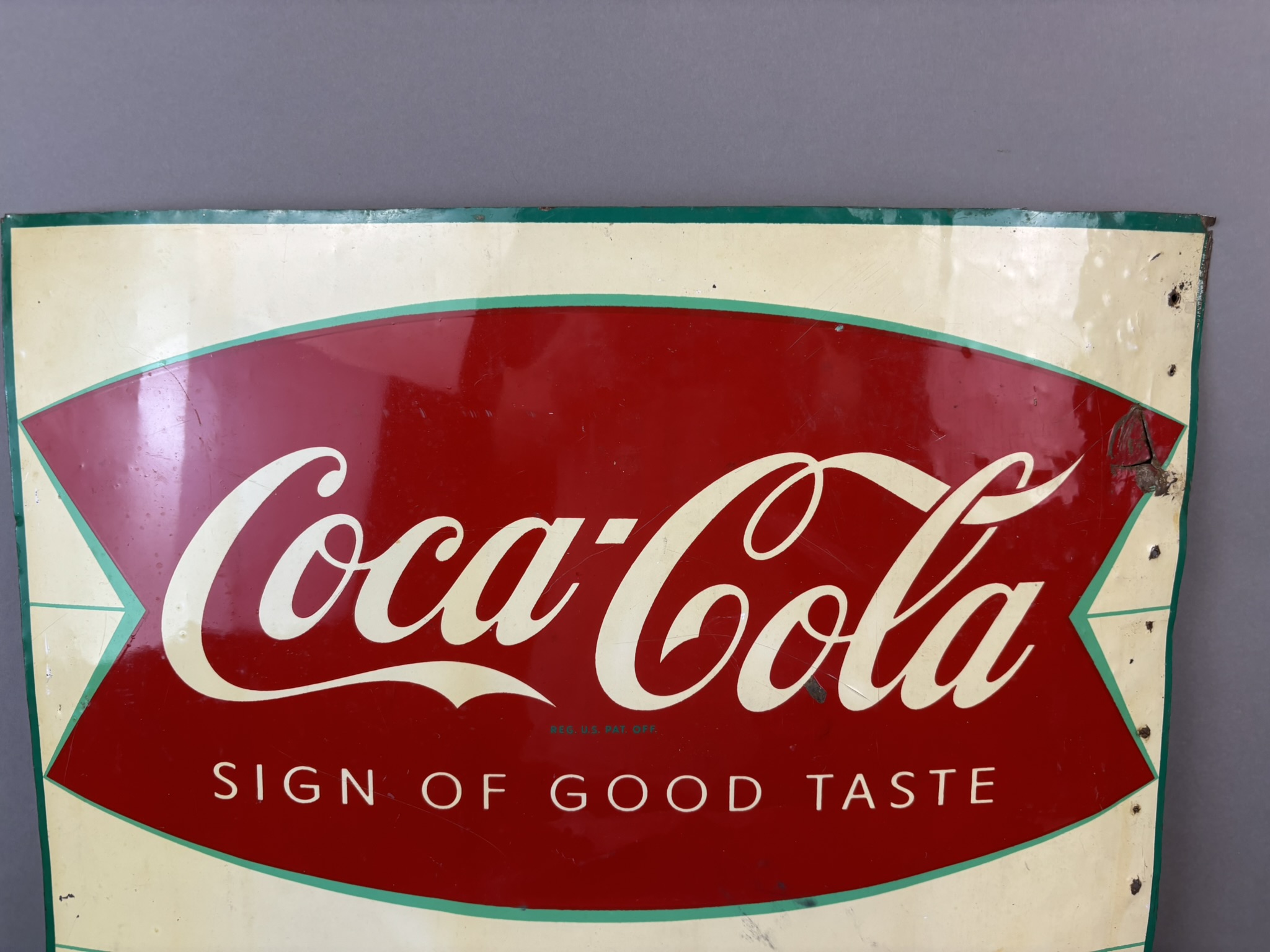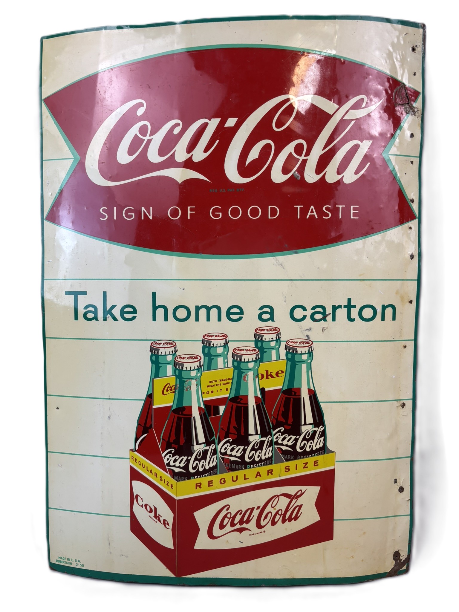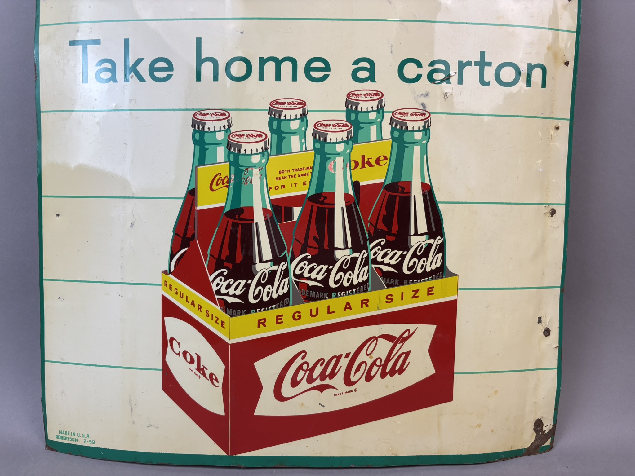 Coca Cola Fishtail Take Home A Carton SST Tin Sign Dated 1959